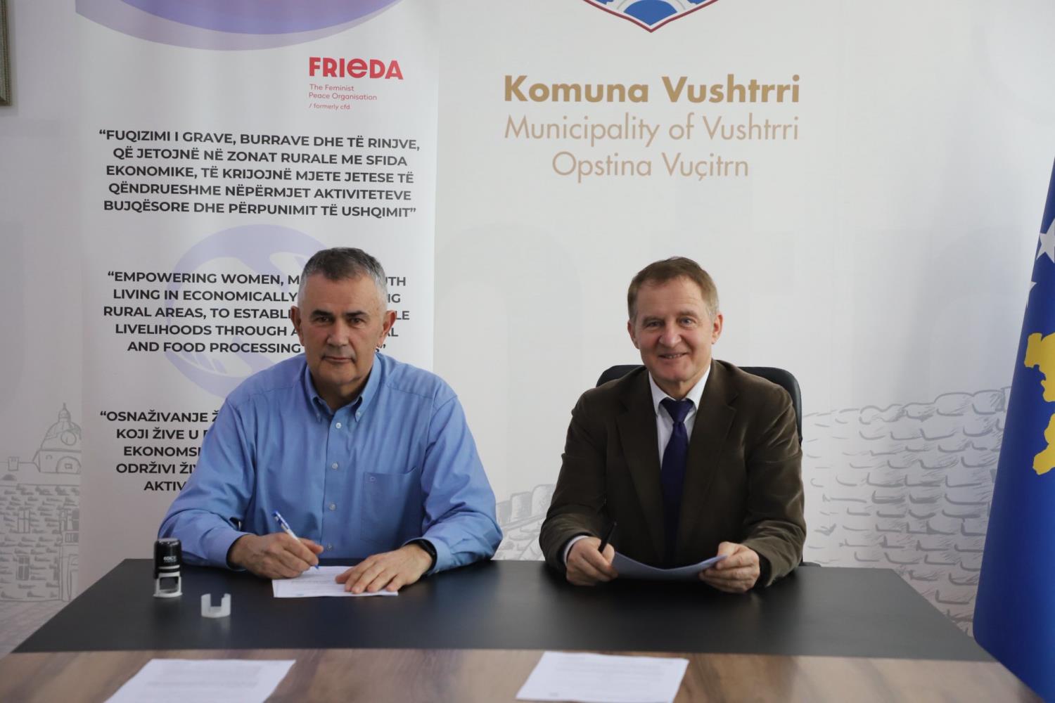 Within the framework of the project “Empowering women, men and youth living in economically challenging rural areas, to establish sustainable livelihoods through agricultural and food processing activities” donor FRIEDA, a cooperation agreement has been signed with the municipalities of Shtime and Vushtrri. Through this agreement, farmers in these municipalities will be supported with grants in the field of agriculture as well as professional training in the processing sector.